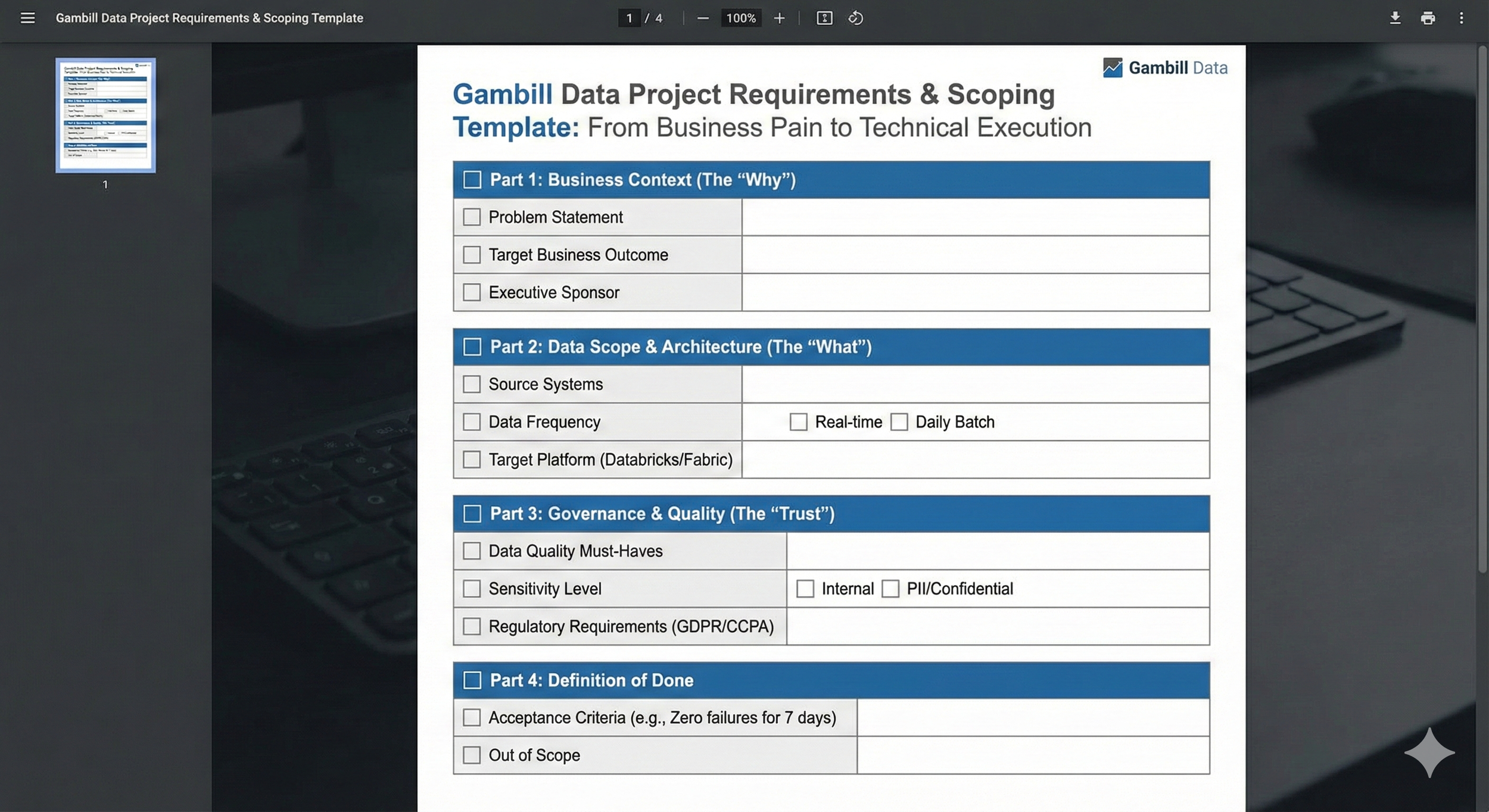 This is the exact framework we use at Gambill Data to initiate engagements. It forces the hard conversations early, ensuring that Business Leaders and Data Engineers are aligned on: